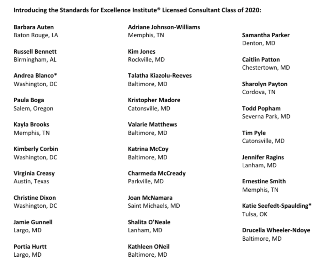 Baltimore, MD – December 18, 2020 The Standards for Excellence Institute, an initiative designed to help nonprofit organizations operate more ethically and accountably, announces its 2020 Class of Licensed Consultants. Twenty-nine class members hailing from various regions of the country completed the intensive, five-day virtual training seminar and can assist nonprofits nationwide. They bring years of experience to the table and represent organizations from Louisiana to Maryland to Oregon– and many in between.